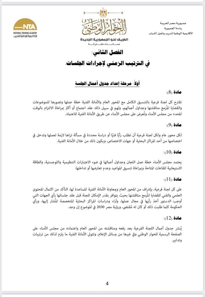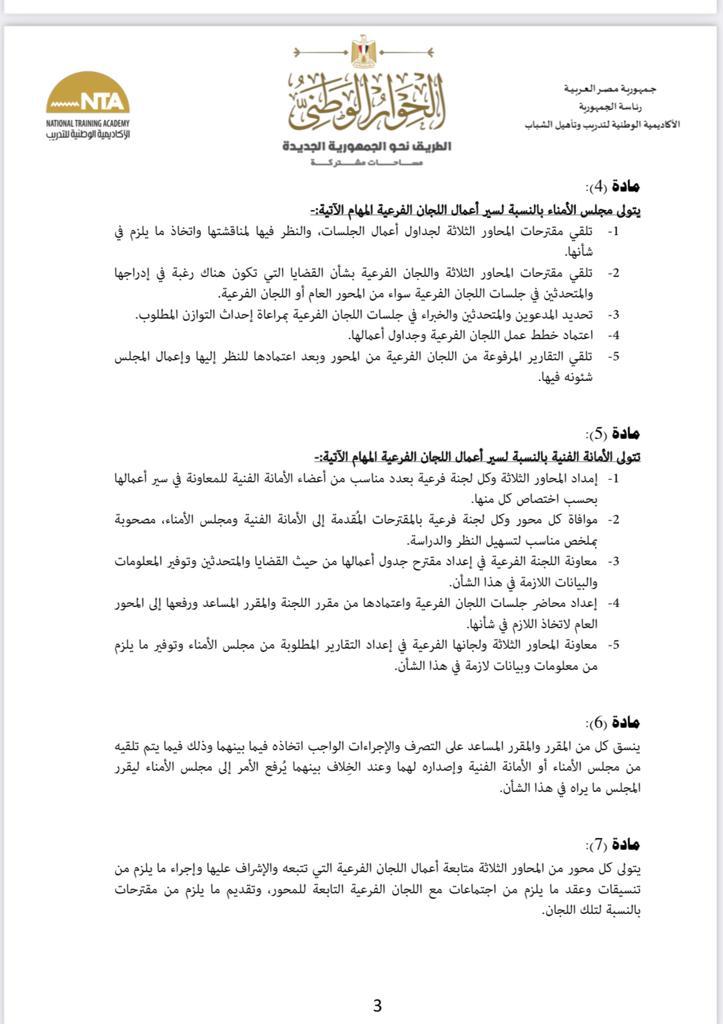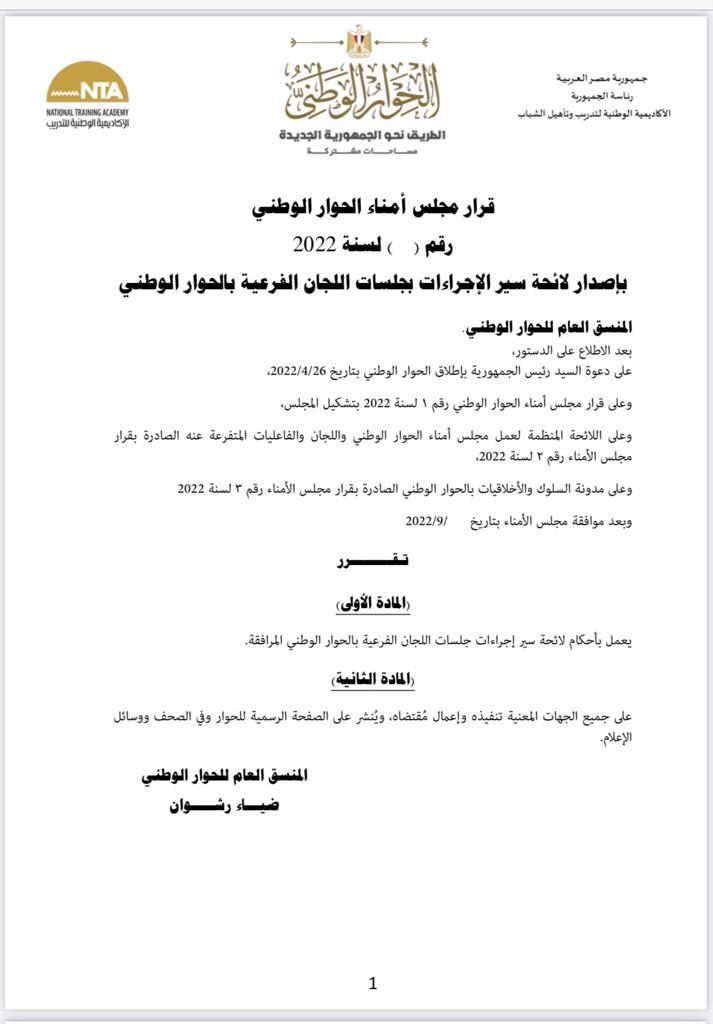 بعد الاطلاع على الدستور، على دعوة رئيس الجمهورية بإطلاق الحوار الوطني بتاريخ 26/4/2022، وعلى قرار مجلس أمناء الحوار الوطني رقم 1 لسنة 2022 بتشكيل المجلس،