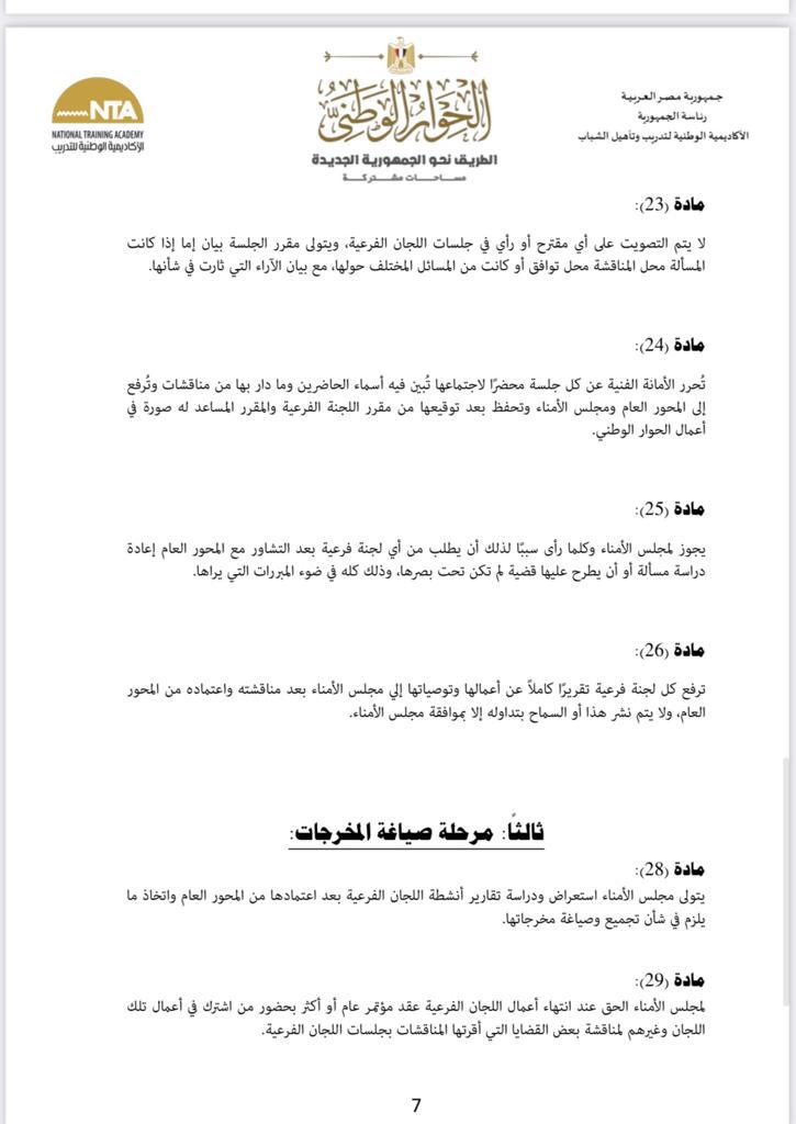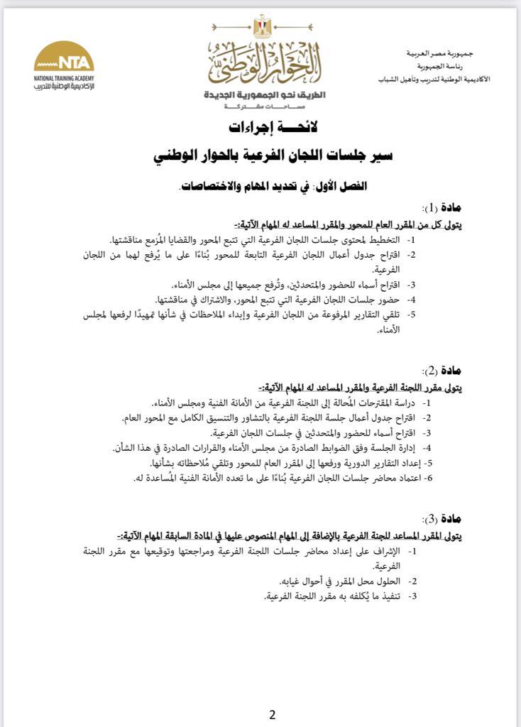 استقر مجلس أمناء الحوار الوطني على إصدار لائحة سير الإجراءات بجلسات اللجان الفرعية بالحوار الوطني، فيما يخص تحديد المهام والاختصاصات لكل من المقرر العام ومساعده، ومقرري اللجان الفرعية ومساعديهم، ومجلس الأمناء والأمانة الفنية، بالإضافة إلى الترتيب الزمني لإجراءات الجلسات وإدارتها، وصياغة المخرجات.