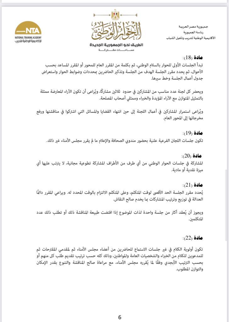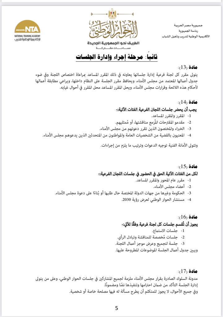 مدونة السلوك الصادرة بقرار مجلس الأمناء ملزمة لجميع المشاركين في جلسات الحوار الوطني، وعلى من يتولى إدارة الجلسة التأكد من ضمان احترامها وتنفيذها نصًا ومضمونًا.