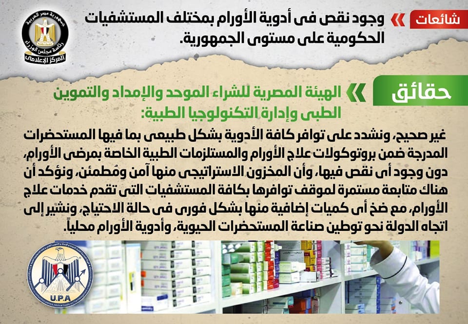 قام المركز الإعلامي لمجلس الوزراء بالتواصل مع الهيئة المصرية للشراء الموحد والإمداد والتموين الطبي وإدارة التكنولوجيا الطبية، والتي نفت تلك الأنباء، مُؤكدةً أنه لا صحة لوجود نقص في أدوية الأورام بمختلف المستشفيات الحكومية على مستوى الجمهورية، مُشددةً على توافر كافة الأدوية بشكل طبيعي بما فيها المستحضرات المدرجة ضمن بروتوكولات علاج الأورام والمستلزمات الطبية الخاصة بمرضى الأورام، دون وجود أي نقص فيها، وأن المخزون الاستراتيجي منها آمن ومُطمئن، مؤكدةً أن هناك متابعة مستمرة لموقف توافرها بكافة المستشفيات التي تقدم خدمات علاج الأورام، مع ضخ أي كميات إضافية منها بشكل فوري في حالة الاحتياج، مشيرةً إلى اتجاه الدولة نحو توطين صناعة المستحضرات الحيوية، وأدوية الأورام محلياً.