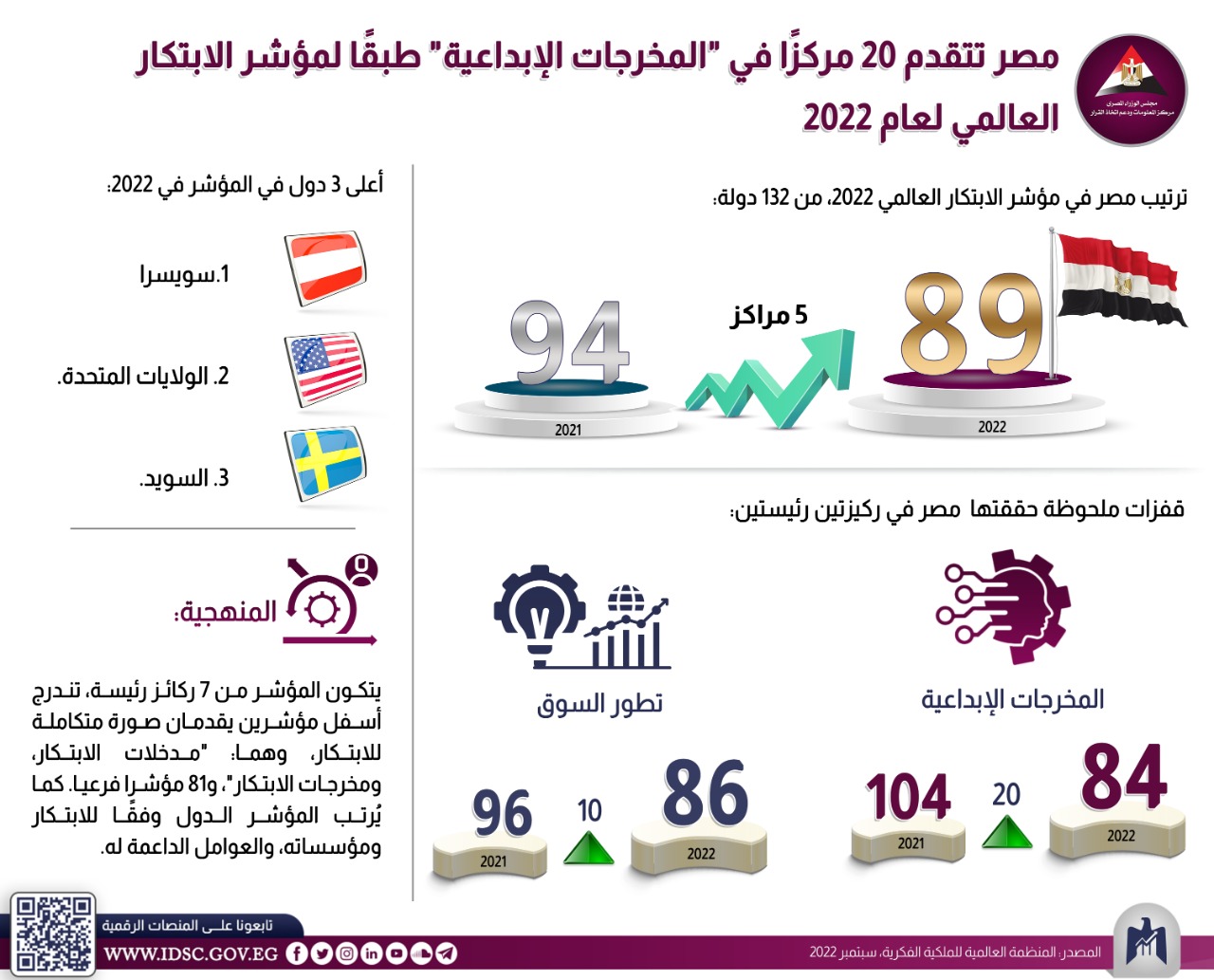 إنفوجرافيك جديد نشره مركز معلومات مجلس الوزراء المصري فوفقًا لأحدث تقرير صادر عن "المنظمة العالمية للملكية الفكرية" لعام 2022، أظهرت مصر تقدمًا ملحوظًا في "مؤشر الابتكار العالمي" لعام 2022، متقدمة 5 مراكز؛ حيث جاءت في المركز الـ 89 عالميًّا من بين 132 دولة، مقارنة بالمركز الـ 94 في 2021.