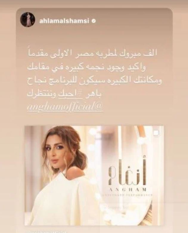 حرصت المطربة أحلام على تهنئة المطربة أنغام ببرنامجها الجديد وكتبت عبر حسابها بموقع التواصل الاجتماعي “انستجرام”:"ألف مبروك لمطربة مصر الأولى مقدما واكيد وجود نجمة كبيرة فى مقامك ومكانتك الكبيرة سيكون للبرنامج نجاح باهر .. احبك وننتظرك".