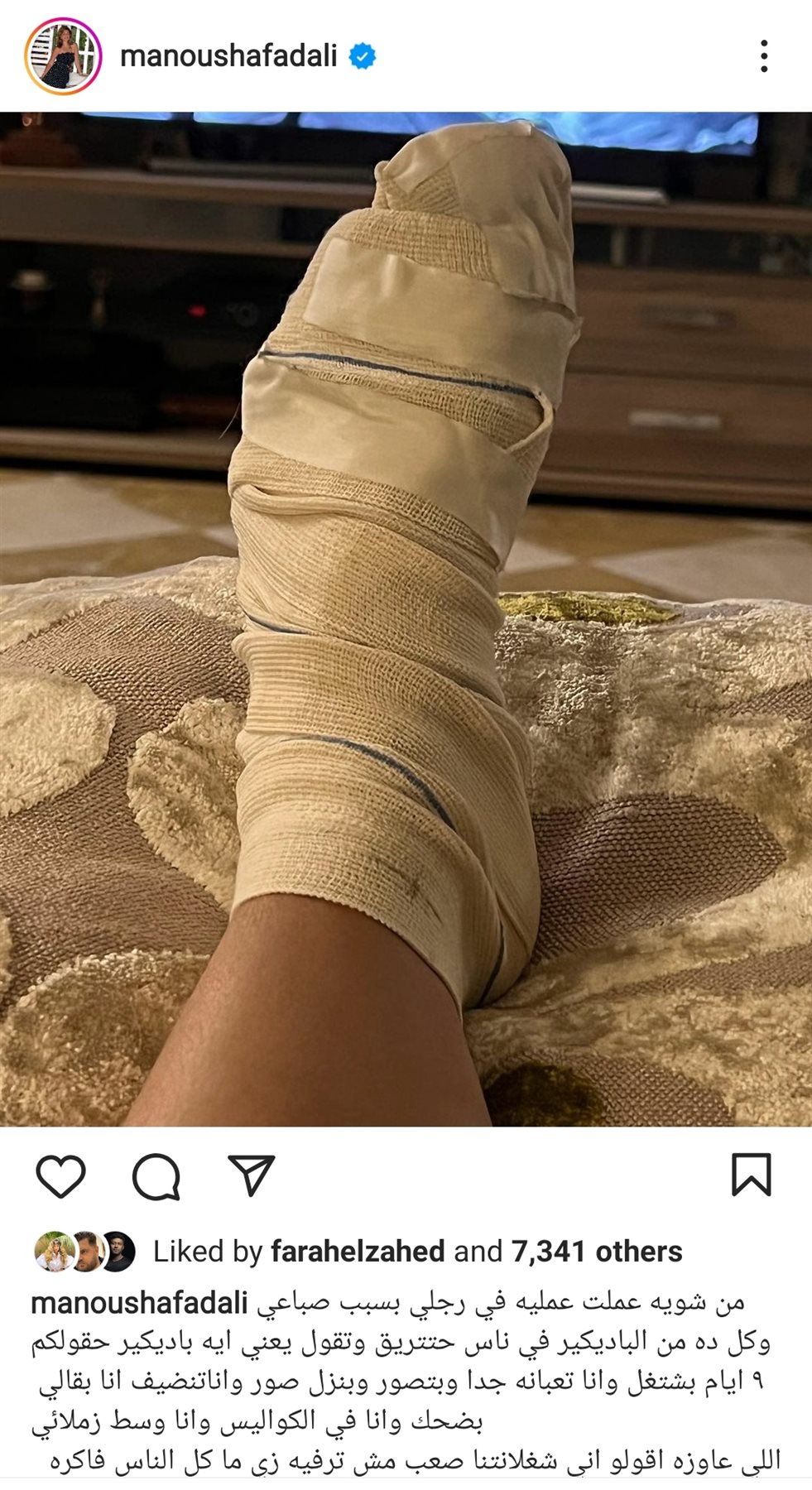 أعلنت الفنانة منة فضالي عن خضوعها لعملية جراحية في القدم أثناء تصوير أحد الأعمال، وذلك على صفحتها على موقع تبادل الصور والفيديوهات إنستجرام.