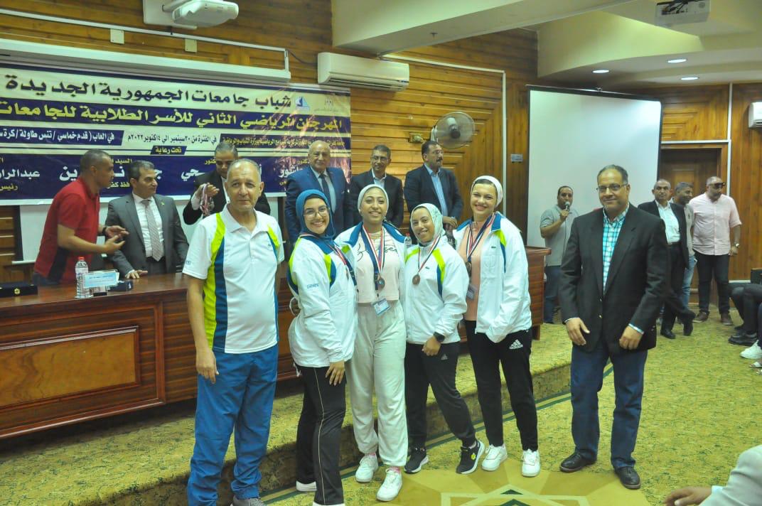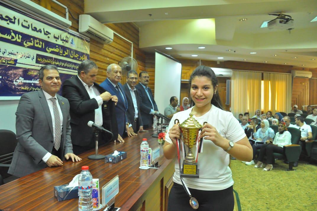 شهد حفل الختام وتوزيع الجوائز الاستاذ الدكتور عبدالرازق دسوقي رئيس جامعة الزقازيق ، الاستاذ الدكتور محمد عبدالعال نائب رئيس الجامعة لشئون التعليم والطلاب؛ الدكتور احمد حسان مدير عام الإدارة العامة للنشاط الرياضي الطلابي بالوزارة ، الأستاذ الدكتور طايع عبد اللطيف مستشار وزير التعليم العالي والبحث العلمي للأنشطة الطلابية، والدكتور رشدي العدوي منسق عام الأنشطة الطلابية، وعمداء كليات واعضاء هيئة التدريس بالجامعة ، الأستاذ محمد على عبدالسميع مدير إدارة الجامعات ،حسين جمعة ،إسلام عاطف حسانين الأخصائيين الرياضيين بالإدارة.