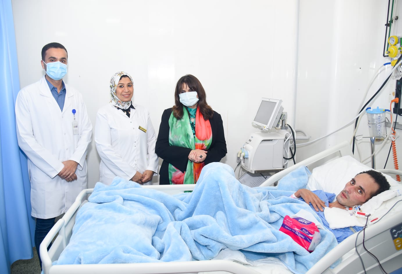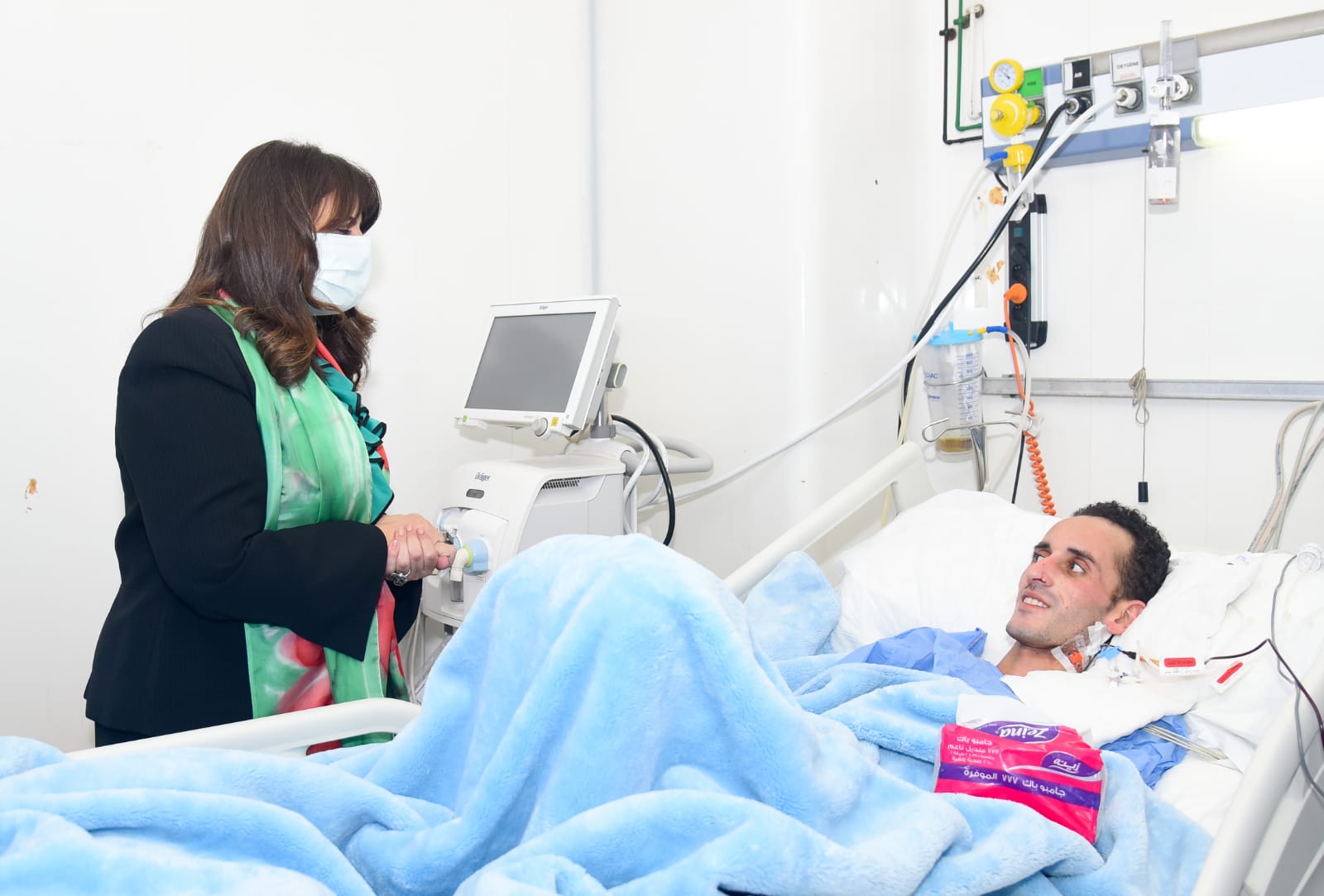 وزيرة الهجرة تزور الشاب أحمد حسين بمستشفى دار الشفاء بعد عودته لمصر