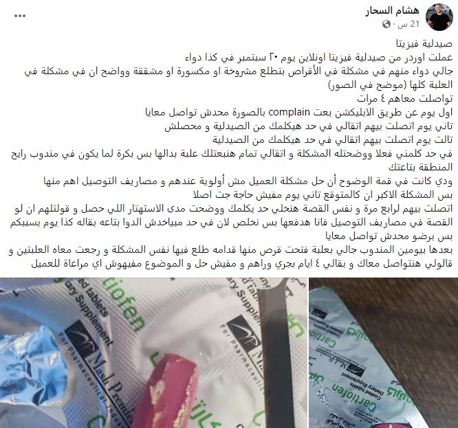 واستطرد مشكلته مع صيدلية فيزيتا قائلا " اتصلت بيهم لرابع مرة و نفس القصة هنخلي حد يكلمك ووضحت مدى الاستهتار اللي حصل و قولتلهم ان لو القصة في مصاريف التوصيل فانا هدفعها بس نخلص لان في حد مبياخدش الدوا بتاعه بقاله كذا يوم بسببكم بس برضو محدش تواصل معايا بعدها بيومين المندوب جالي بعلبة فتحت قرص منها قدامه طلع فيها نفس المشكلة و رجعت معاه العلبتين و قالولي هنتواصل معاك و بقالي 4 ايام بجري وراهم و مفيش حل و الموضوع مفيهوش اي مراعاة للعميل".