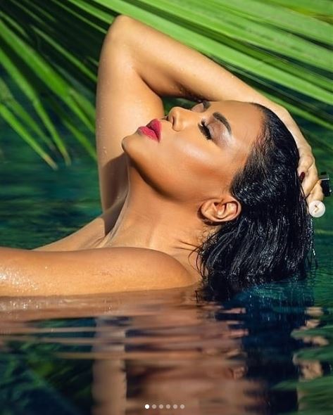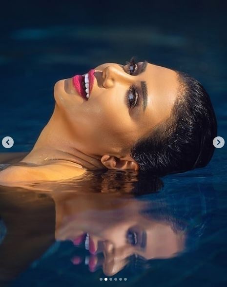 ظهرت رانيا يوسف داخل حمام السباحة ، وتركت شعرها إلى الوراء، كما وضعت "ميك اب" كثيف.
