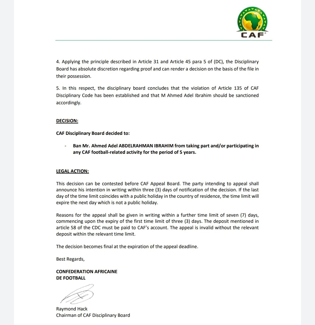 وقرر الاتحاد الأفريقي لكرة القدم "كاف"، إيقاف الثلاثي أحمد عادل عبد الرحمن إبراهيم "مصر"، رفيق محمدي "تونس"، يوسف روسي "المغرب"، لمدة 5 سنوات، ومنعهم من ممارسة أي نشاط متعلق بكرة القدم.