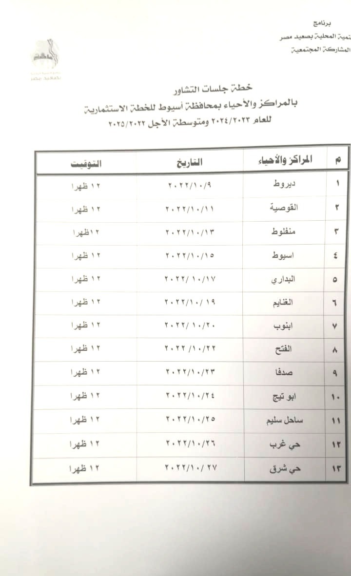 يذكر أن محافظ أسيوط قد أكد – في وقت سابق - على أهمية جلسات التشاور التي سيجري تنفيذها بمشاركة أعضاء مجلسي الشيوخ والنواب ومؤسسات المجتمع المدني والجمعيات الأهلية والقيادات الشبابية والنسائية وذوي الهمم بالمشاركة في تلك الجلسات لتحقيق أكبر استفادة ممكنة في إطار تنفيذ برنامج التنمية المحلية بصعيد مصر حيث أن الدولة المصرية تعمل بخطى سريعة نحو تنمية صعيد مصر فهي تضع هذ الملف على رأس أولوياتها للارتقاء بمستوي التنمية وتحسين الخدمات المقدمة للمواطنين من خلال تنفيذ مجموعة من المشروعات التنموية بهدف توطين أهداف التنمية المستدامة من خلال التطوير المؤسسي ونظم العمل وتنمية القدرات المحلية لتصبح قادرة على إدارة التنمية وجذب الاستثمارات منوهًا إلى ضرورة الاهتمام بالمشروعات الداعمة للاقتصاد المحلي من خلال أنشطة البرنامج والتي تعد مكونًا أساسيًا في عملية التنمية وذلك لأهميتها في توفير فرص العمل وتأثيرها على استدامة النمو فضلا عن أهمية مكون التكتلات الاقتصادية ووضع خطط متكاملة وشاملة وعمل دراسات جدوى لكل مشروع من المشروعات التي سيتم تنفيذها لتحقيق التنمية والنهضة الاقتصادية في المحافظة بجميع المجالات لإحداث نقلة نوعية شاملة لتوفير حياة كريمة للمواطنين.