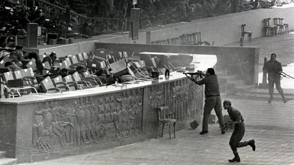 ثم تحول هدوء المنصة التي يشاهد منها كبار رجال الدولة بصحبة الرئيس العرض العسكري، لحالة من الفوضي، بمجرد خروج سياره تحمل مدفع كوري الصنع، عن طريقه المحدد في العرض، ليقف الرئيس السادات وهو ينظر لما يحدث، قبل أن يسمع الجميع دوي طلقات توجه من تلك السيارة التي يقفذ مستقليها إلى أرض العرض العسكري، ليوجه خالد الأسلامبولي رصاص رشاشه تجاه الرئيس محمد أنور السادات.