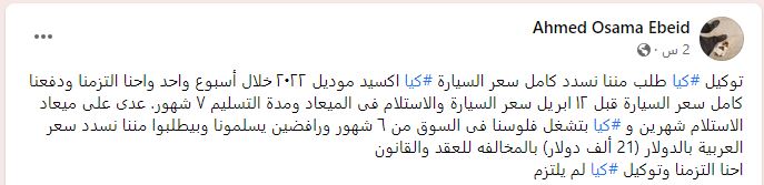 وقال صاحب الاستغاثة عبر السوشيال ميديا " توكيل كيا طلب مننا نسدد كامل سعر السيارة كيا اكسيد موديل 2022 خلال أسبوع واحد واحنا التزمنا ودفعنا كامل سعر السيارة قبل 12 ابريل سعر السيارة والاستلام فى الميعاد ومدة التسليم ٧ شهور. عدى على ميعاد الاستلام شهرين و كيا بتشغل فلوسنا فى السوق من 6 شهور ورافضين يسلمونا وبيطلبوا مننا نسدد سعر العربية بالدولار (21 ألف دولار) بالمخالفه للعقد والقانون..احنا التزمنا وتوكيل كيا لم يلتزم".