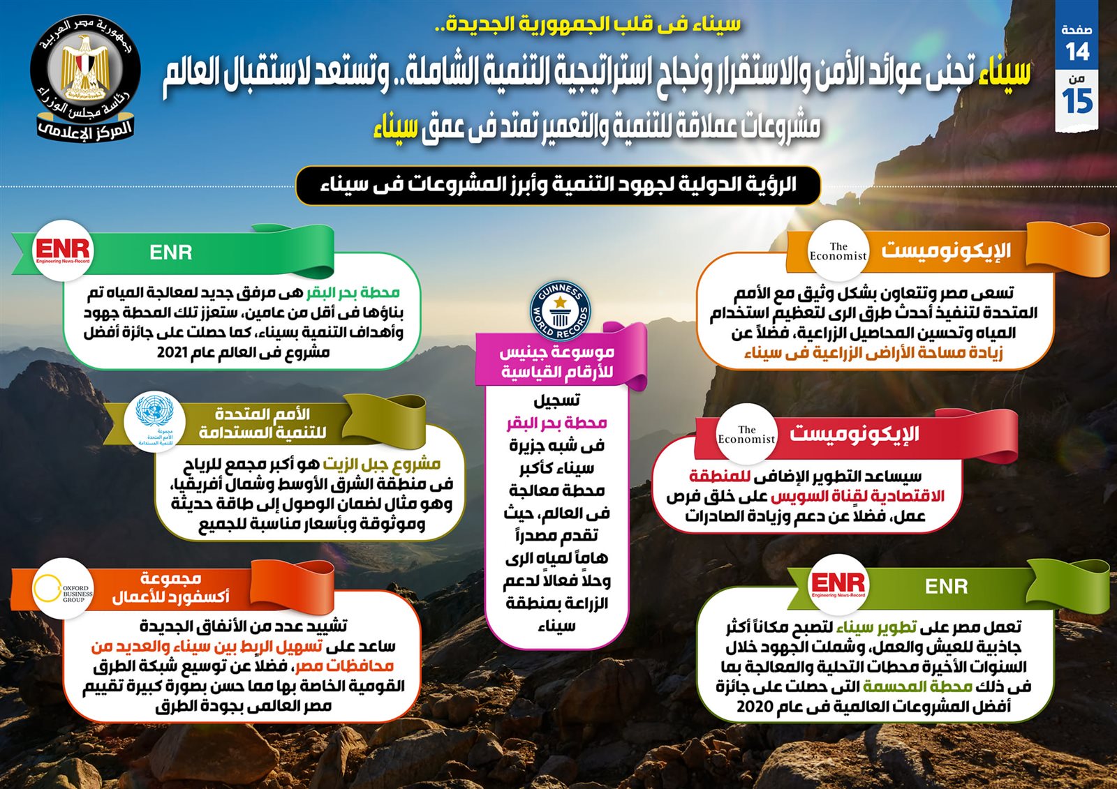 وفي هذا الصدد نشر المركز الإعلامي لمجلس الوزراء تقريراً تضمن إنفوجرافات تسلط الضوء على المشروعات العملاقة للتنمية والتعمير الممتدة في عمق سيناء التي تظل في قلب الجمهورية الجديدة، لتجني بذلك عوائد الأمن والاستقرار ونجاح استراتيجية التنمية الشاملة، وذلك في وقت تستعد فيه لاستقبال العالم.