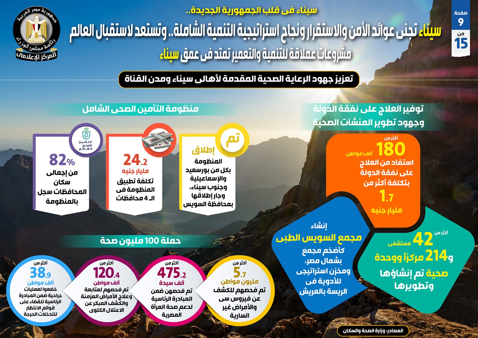 وبشأن تعزيز جهود الرعاية الصحية المقدمة لأهالي سيناء ومدن القناة، جاء في التقرير أنه فيما يتعلق بتوفير العلاج على نفقة الدولة وجهود تطوير المنشآت الصحية، استفاد أكثر من 180 ألف مواطن من العلاج على نفقة الدولة بتكلفة تتجاوز 1.7 مليار جنيه، كما تم إنشاء وتطوير أكثر من 42 مستشفى و214 مركزاً ووحدة صحية، بجانب إنشاء مجمع السويس الطبي كأضخم مجمع بشمال مصر، ومخزن استراتيجي للأدوية في الريسة بالعريش.