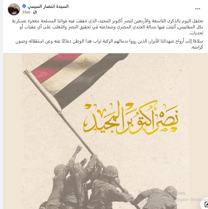 وقالت السيدة انتصار السيسي، خلال منشور عبر صفحتها الرسمية على فيس بوك، أنّ المعجزة أثبتت بسالة الجندي المصري وشجاعته في تحقيق النصر والتغلب على أي عقبات أو تحديات.