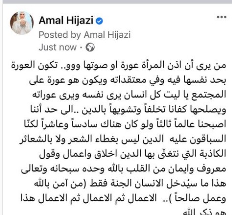 عبرت الفنانة اللبنانية أمل حجازي على لأن الدين ليس غطاء للشعر، بل الدين أخلاق وأشارت عن أن صوت المرأة عورة هذا تشويها بالدين، ونشرت أمل حجازي عبر صفحتها على موقع التواصل الإجتماعي “الفيسبوك”.