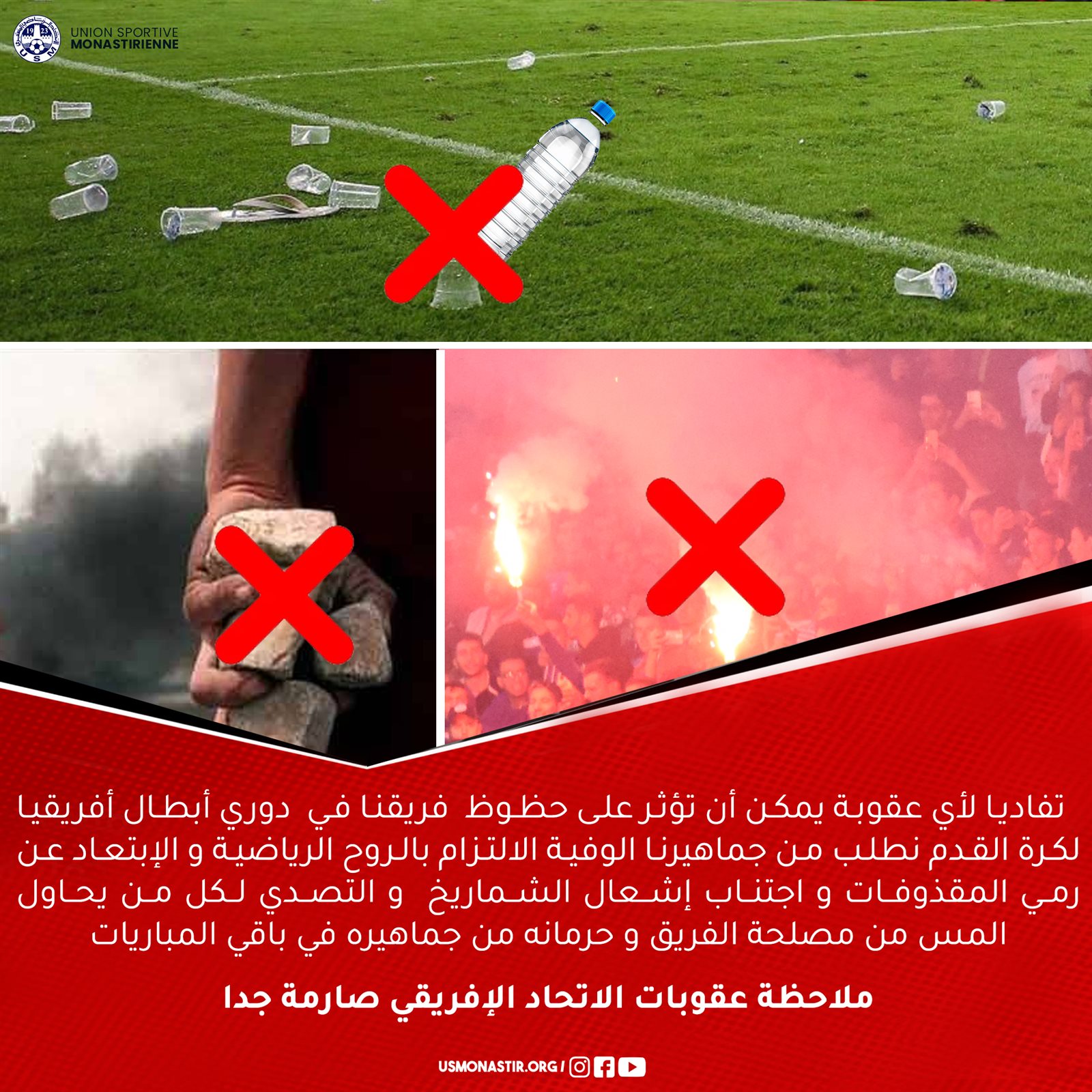 وقال الاتحاد المنستيري التونسي عبر صفحته الرسمية بموقع "فيس بوك"، تفادياً لأي عقوبة يمكن أن تؤثر على حظوظ فريقنا في دوري أبطال أفريقيا لكرة القدم نطلب من جماهيرنا الوفية الالتزام بالروح الرياضية والإبتعاد عن رمي المقذوفات واجتناب إشعال الشماريخ والتصدي لكل من يحاول المس من مصلحة الفريق وحرمانه من جماهيره في باقي المباريات ، علماً بأن عقوبات الاتحاد الإفريقي صارمة جداً".