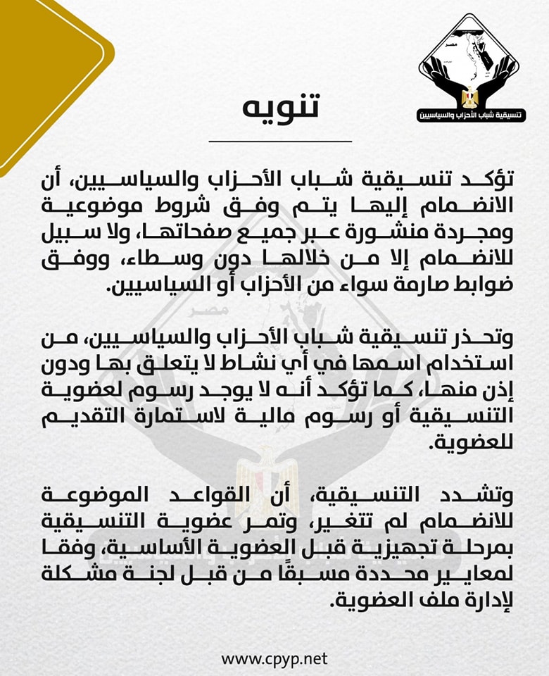 وحذرت تنسيقية شباب الأحزاب والسياسيين، من استخدام اسمها في أي نشاط لا يتعلق بها ودون إذن منها، كما أكدت على أنه لا يوجد رسوم لعضوية التنسيقية أو رسوم مالية لاستمارة التقديم للعضوية.