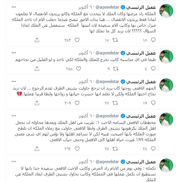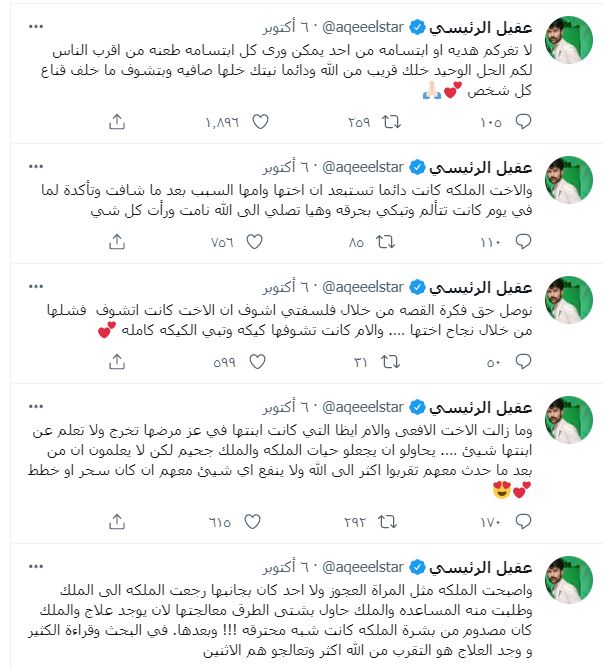جاء ذلك في سلسلة تغريدات مبطنة، سرد فيها ممارسات شقيقة زوجته ووالدتها دون أن يُسميهما، ملمحاً إلى أنهما المقصودتان بـ الإشارة إلى تبدل حال زوجته وتدهور حالتها الصحية ومُعاناتها من تداعيات انسحاب الكورتيزون ( الستيرويد) من جسمها خلال الأشهر القليلة الماضية.