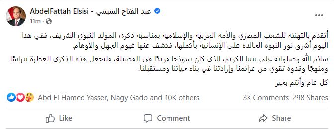 وكتب الرئيس عبد الفتاح السيسي على "فيس بوك": أتقدم بالتهنئة للشعب المصري والأمة العربية والإسلامية بمناسبة ذكرى المولد النبوي الشريف، ففي هذا اليوم أشرق نور النبوة الخالدة على الإنسانية بأكملها، فكشف عنها غيوم الجهل والأوهام.