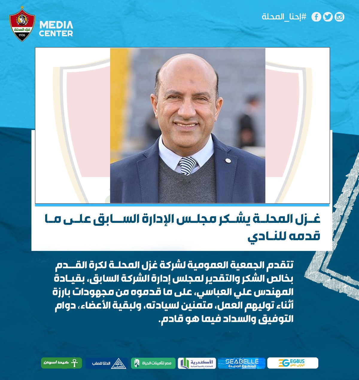 تتقدم الجمعية العمومية لشركة غزل المحلـة لكرة القــدم بخالص الشكر والتقدير لمجلس إدارة الشركة السابق، بقيـادة المهندس علي العباسي، على ما قدموه من مجهودات بارزة أثناء توليهم العمل، متمنين لسيادته، ولبقية الأعضاء، دوام التوفيق والسداد فيما هو قادم.