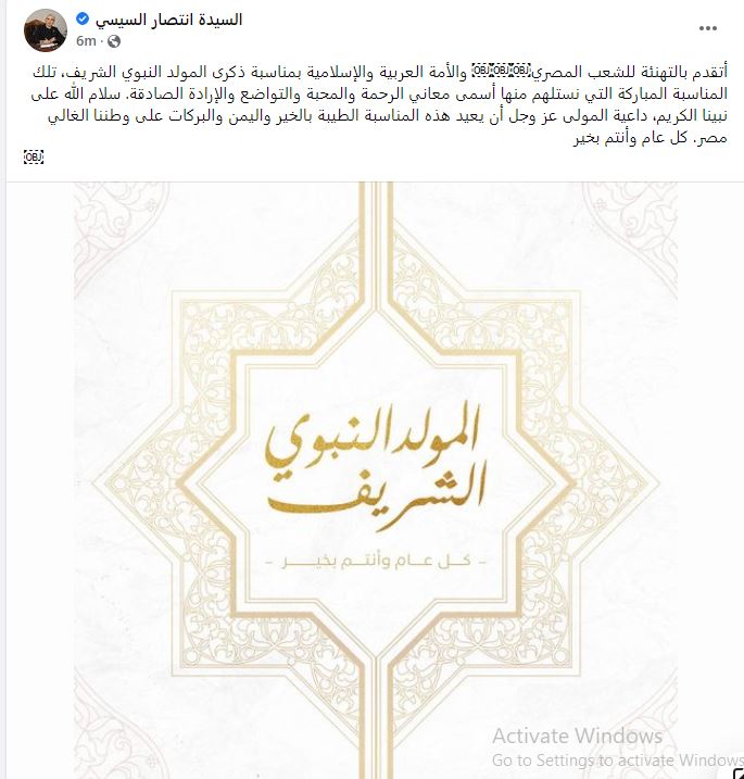 وكتبت السيدة انتصار السيسى، على صفحتها الرسمية بموقع التواصل الاجتماعى "فيس بوك":"سلام الله على نبینا الكریم، داعیة المولى عز وجل أن یعید ھذه المناسبة الطیبة بالخیر والیمن والبركات على وطننا الغالي مصر. كل عام وأنتم بخیر".