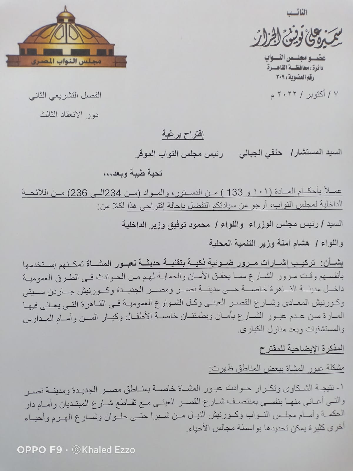 تقدمت النائبة سميرة الجزار، عضو مجلس النواب عن الحزب المصري الديمقراطي الاجتماعي باقتراح برغبةللمستشار حنفي الجبالي رئيس مجلس النواب لتقديمه لرئيس مجلس الوزراء ووزير الداخلية ووزير التنمية المحلية بشأن: تركيب إشارات مرور ضوئية ذكية بتقنية حديثة لعبور المشاة تمكنهم من إستخدامها بأنفسهم وقت مرور الشارع مما يحقق الأمان والحماية لهم من الحوادث فى الطرق العمومية داخل مدينة القاهرة خاصة حى مدينة نصر ومصر الجديدة وكورنيش جاردن سيتى وكورنيش المعادى وشارع القصر العينى وكل الشوارع العمومية فى القاهرة التى يعانى فيها المارة من عدم عبور الشارع بأمان خاصة الأطفال وكبار السن وأمام المدارس والمستشفيات وبعد منازل الكبارى.
