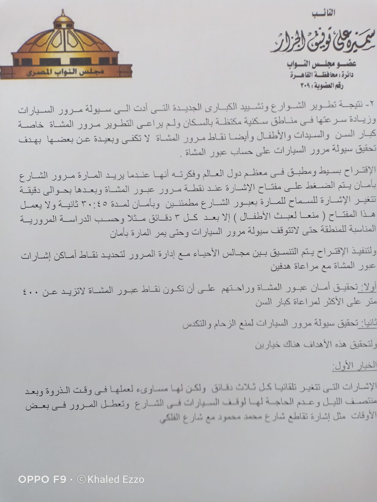 كما اوضحت النائبة أن إدارة المرور لدينا بها مهندسين طرق وبحوث عمليات لتنفيذ الإقتراح وتحديد نقاط مرور عبور المشاة مع مجالس الأحياء تحت إشراف المحافظة والمجتمع المدنى المهتم بالطرق والشوارع ونواب مجلس النواب والشيوخ المعنيين والمهتمين بأحياء دوائرهم الإنتخابية.