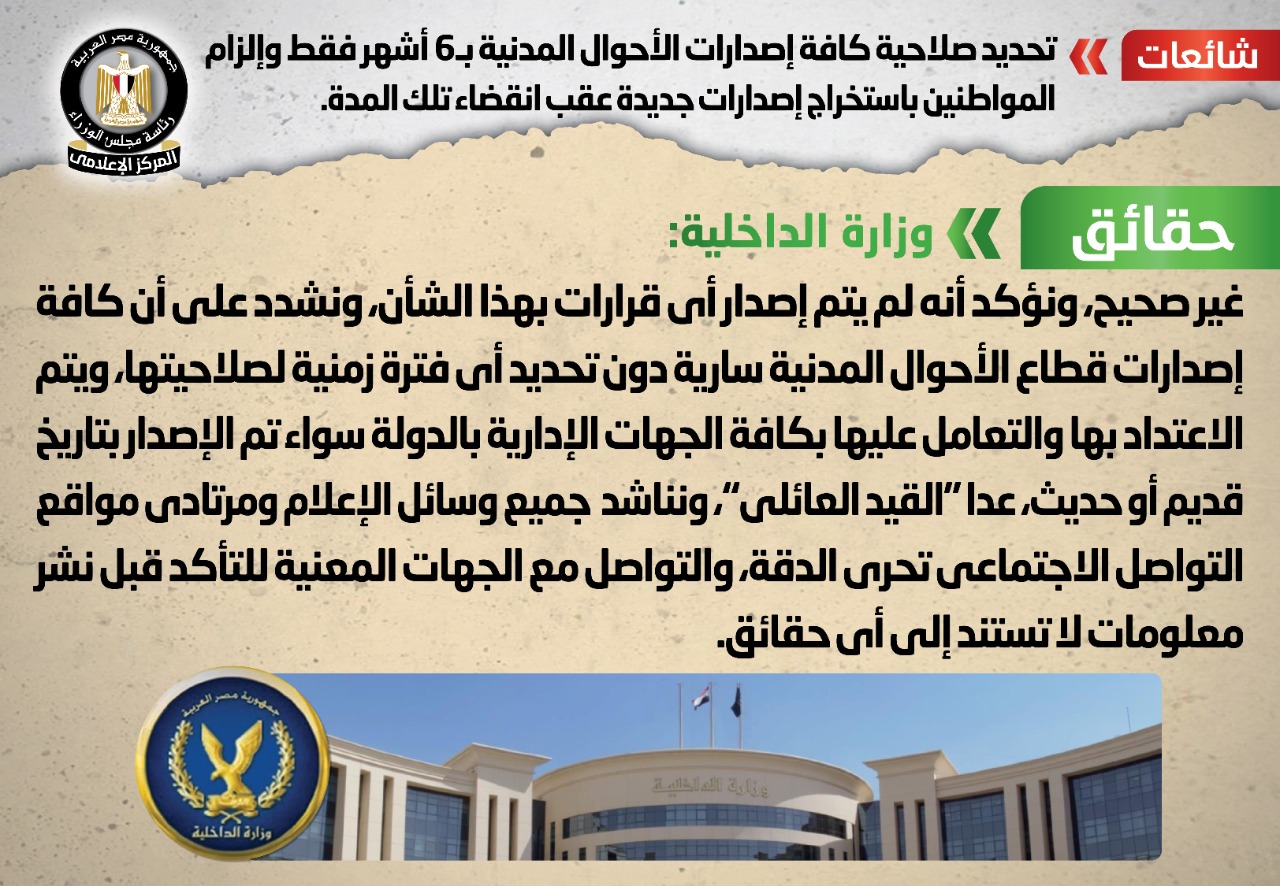 نفي المركز الإعلامي لمجلس الوزراء، ما تداولته بعض المواقع الإلكترونية وصفحات التواصل الاجتماعي من أنباء بشأن تحديد صلاحية إصدارات الأحوال المدنية بـ6 أشهر فقط، وإلزام المواطنين باستخراج إصدارات جديدة عقب انقضاء تلك المدة، وقام المركز الإعلامي لمجلس الوزراء بالتواصل مع وزارة الداخلية والتي نفت تلك الأنباء.