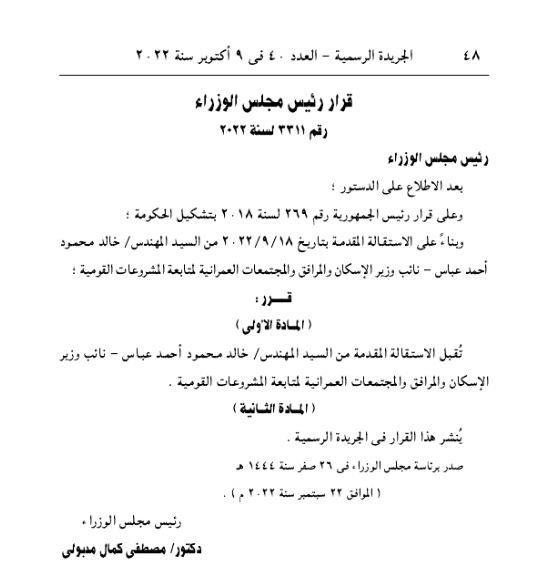نشرت الجريدة الرسمية قرار رئيس مجلس الوزراء د. مصطفى مدبولي، بقبول استقالة المهندس خالد محمود أحمد عباس - نائب وزير الإسكان والمرافق والمجتمعات العمرانية لمتابعة المشروعات القومية .