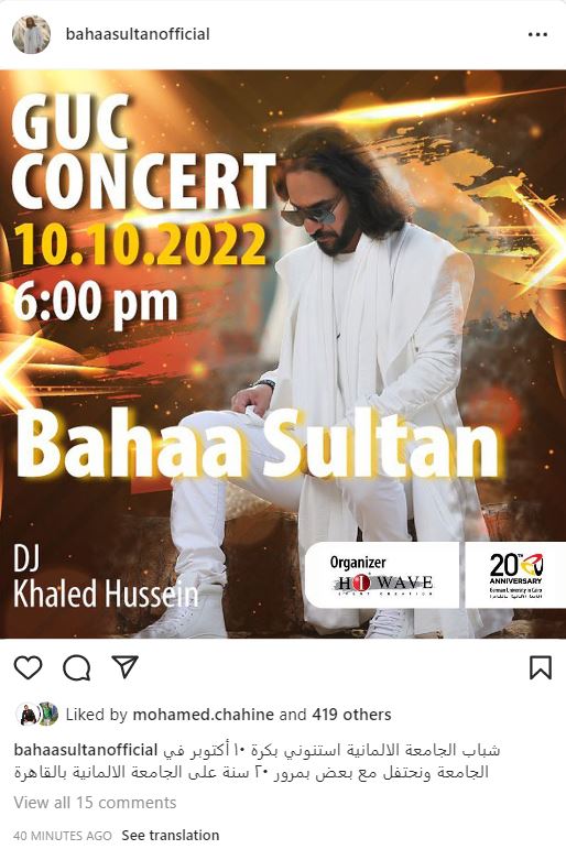 وعلق بهاء سلطان علي الصورة قائلا:"شباب الجامعة الالمانية استنوني بكرة ١٠ أكتوبر في الجامعة ونحتفل مع بعض بمرور ٢٠ سنة على الجامعة الالمانية بالقاهرة".