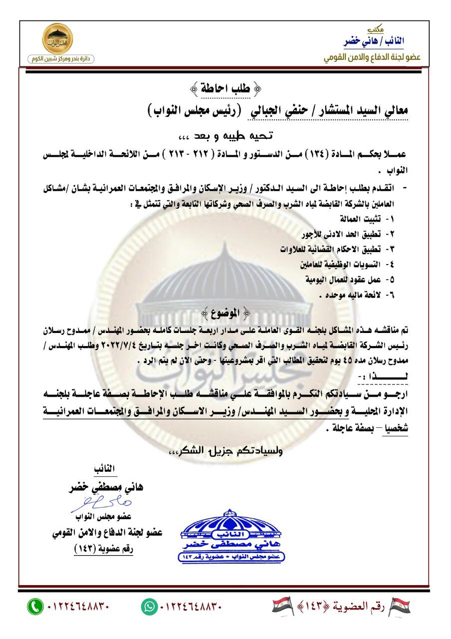 تقدم النائب هاني خضر بطلب إحاطة إلى المستشار حنفي الجبالي رئيس مجلس النواب وفقاً للمادة ( 134) من الدستور والمادة (212-213) من اللائحة الداخلية لمجلس النواب، بشأن مشاكل العاملين بشركة مياه الشرب والصرف الصحي، والشركات التابعه لها التي تتمثل في: