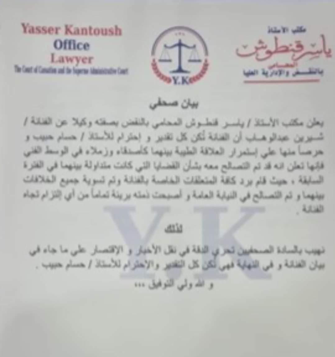 أوضح “قنطوش” في بيانه: “إن الفنانة شيرين عبد الوهاب تكن كل تقدير واحترام لحسام حبيب وحرصًا منها على استمرار العلاقة الطيبةبينهما كأصدقاء وزملاء في الوسط الفني فإنها تعلن أنها قد تم التصالح معه بشأن القضايا التي كانت متداولة بينهما في الفترة الأخيرة“.