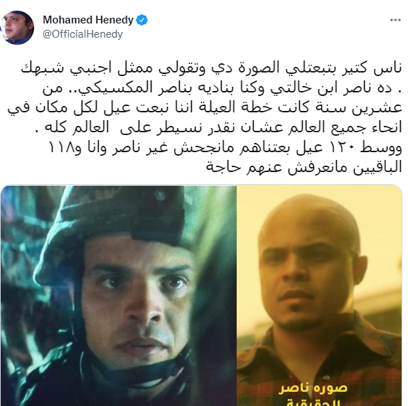 وأضاف: "ده ناصر ابن خالتي وكنا بناديه بناصر المكسيكي.. من عشرين سنة كانت خطة العيلة اننا نبعت عيل لكل مكان في انحاء جميع العالم عشان نقدر نسيطر على العالم كله، ووسط 120 عيل بعتناهم ما نجحش غير ناصر وأنا و118 الباقيين مانعرفش عنهم حاجة".