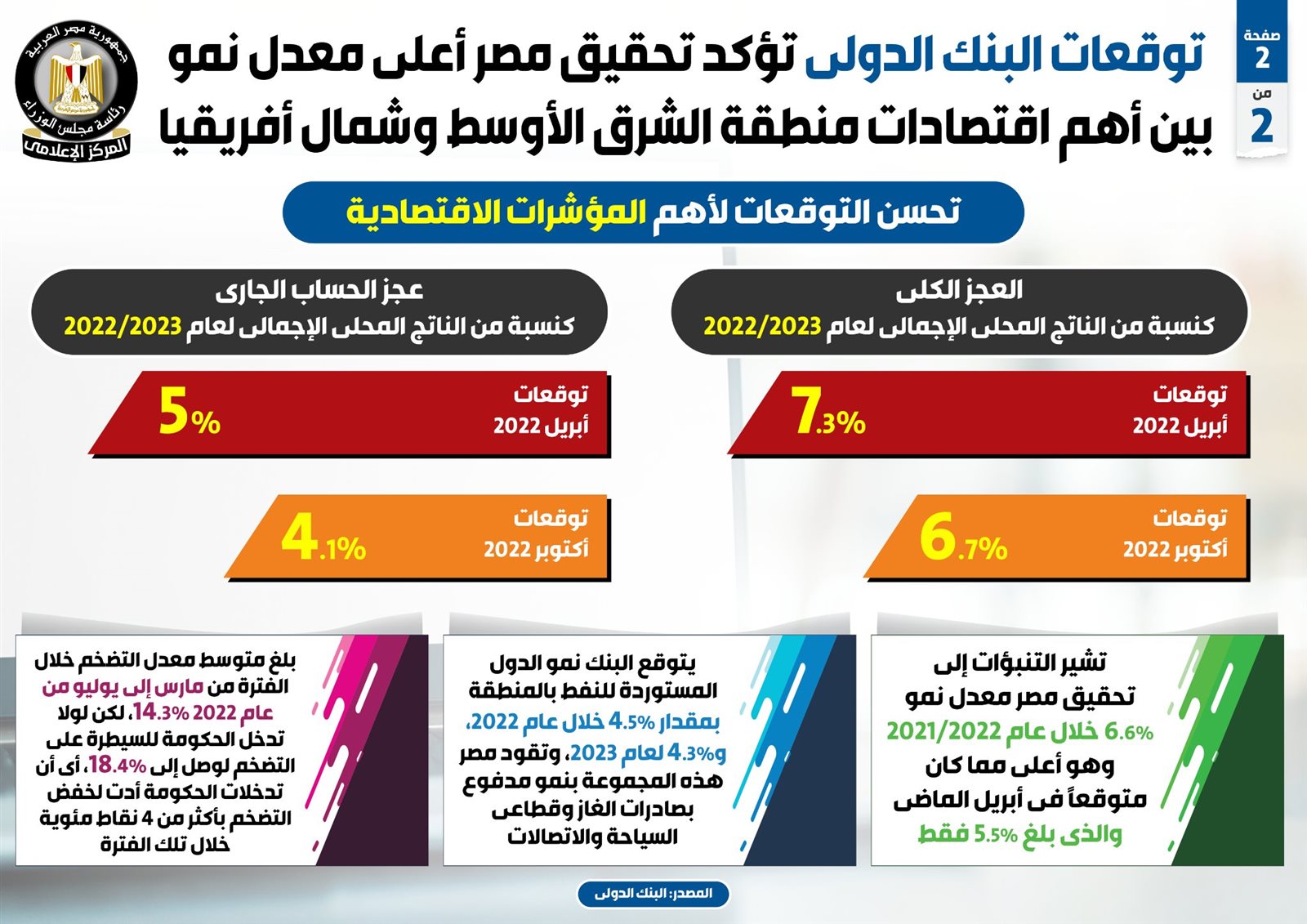 وفي هذا الصدد نشر المركز الإعلامي لمجلس الوزراء تقريراً تضمن إنفوجرافات تسلط الضوء على تأكيد توقعات البنك الدولي تحقيق مصر أعلى معدل نمو بين أهم اقتصادات منطقة الشرق الأوسط وشمال أفريقيا.