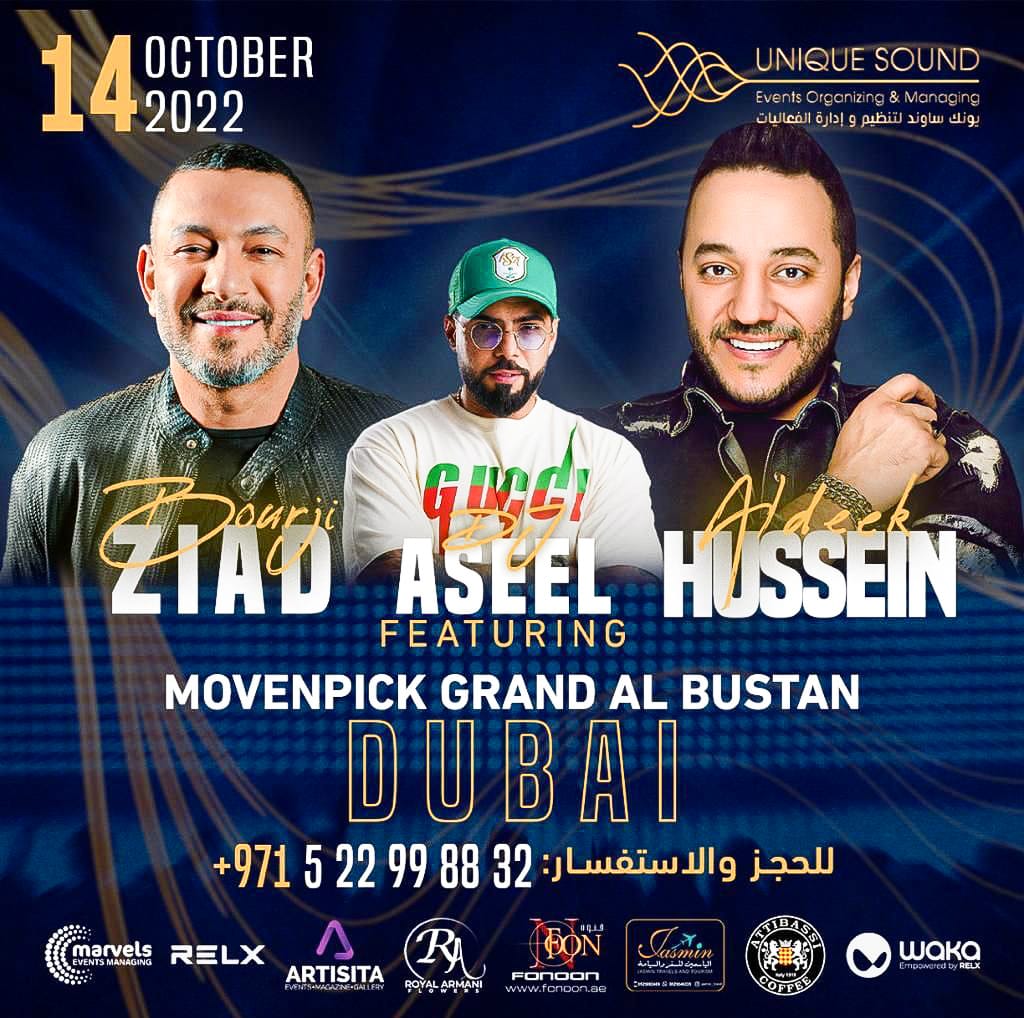 يشارك النجوم اللبناني زياد برجي والسوري حسين الديك وال dj العالمي أصيل في إحياء حفلا ضخما يوم 14 اكتوبر الجاري بدبي داخل موفمبيك جراند البستان.