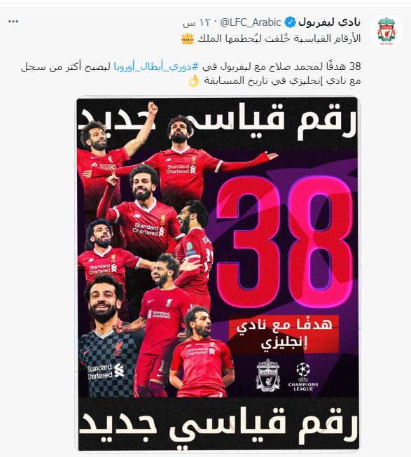وغرد فريق ليفربول على حسابه الرسمي على "تويتر": الأرقام القياسية خُلقت ليُحطمها الملك..38 هدفًا لمحمد صلاح مع ليفربول في دوري أبطال أوروبا ليصبح أكثر من سجل مع نادي إنجليزي في تاريخ المسابقة.