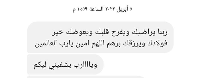 ورد الزوج على رسالة زوجته قائلًا: "ربنا يحفظك ويعطيك طول العمر ويرزقك الصحة والعافية يا غالية، ما تقوليش كده أبدًا أنتي هترجعي أحسن من الأول إن شاء الله".