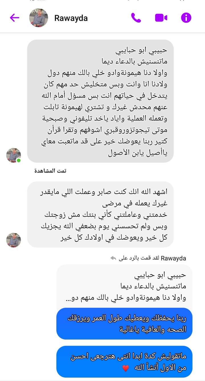 كما نشر صورة زوجته ورسالتها الأخيرة له، والتي توصيه فيها بنجليهما عبد المهيمن واياد، وطالبته بعدم تدخل أحد في حياتهما، كونه المسئول أمام الله عنهما، كما طالبته بشراء تابلت لعبد المهيمن وإجراء عملية له، وأوصته بإعطاء هاتفها المحمول لنجلهما إياد، وأن يقوموا بزيارة قبرها وقراءة القرآن الكريم في صبحية يوم الوفاة، وأن يعوضه الله بقدر تعبه معها أثناء مرضها.
