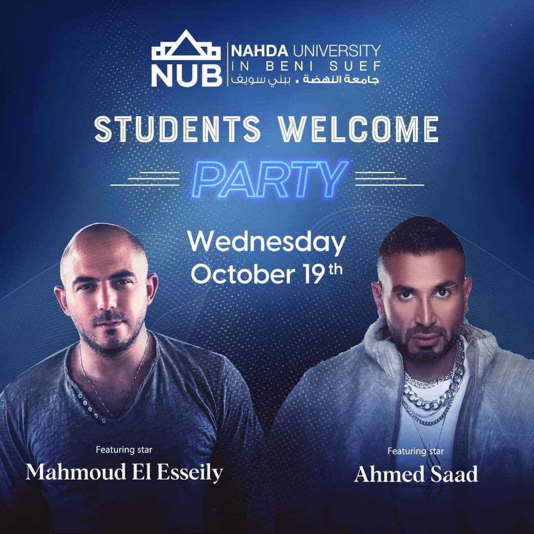 تستقبل جامعة النهضة بمحافظة بني سويف، الفنان أحمد سعد، والفنان محمود العسيلي، يوم الأربعاء الموافق 19 أكتوبر، احتفالاً بالعام الدراسي الجديد 2022-2023