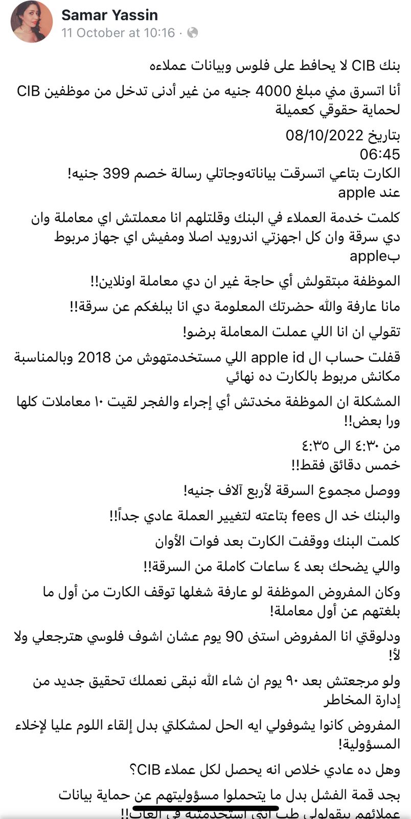 وقالت صاحبة الشكوي ضد بنك CIB،" بنك CIB لا يحافط على فلوس وبيانات عملاءه أنا اتسرق مني مبلغ 4000 جنيه من غير أدنى تدخل من موظفين CIB لحماية حقوقي كعميلة بتاريخ 08/10/2022
