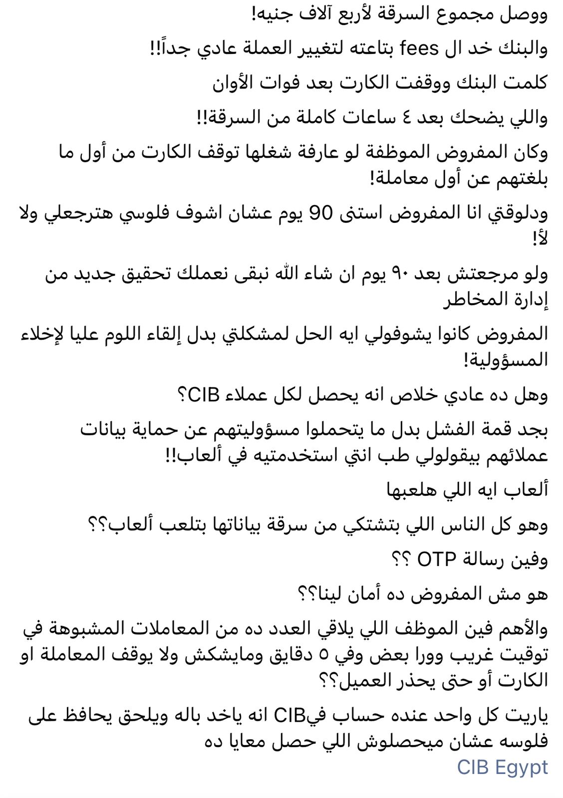 وقالت ،"وهل ده عادي خلاص انه يحصل لكل عملاء CIB؟ بجد قمة الفشل بدل ما يتحملوا مسؤوليتهم عن حماية بيانات عملائهم بيقولولي طب انتي استخدمتيه في ألعاب!!