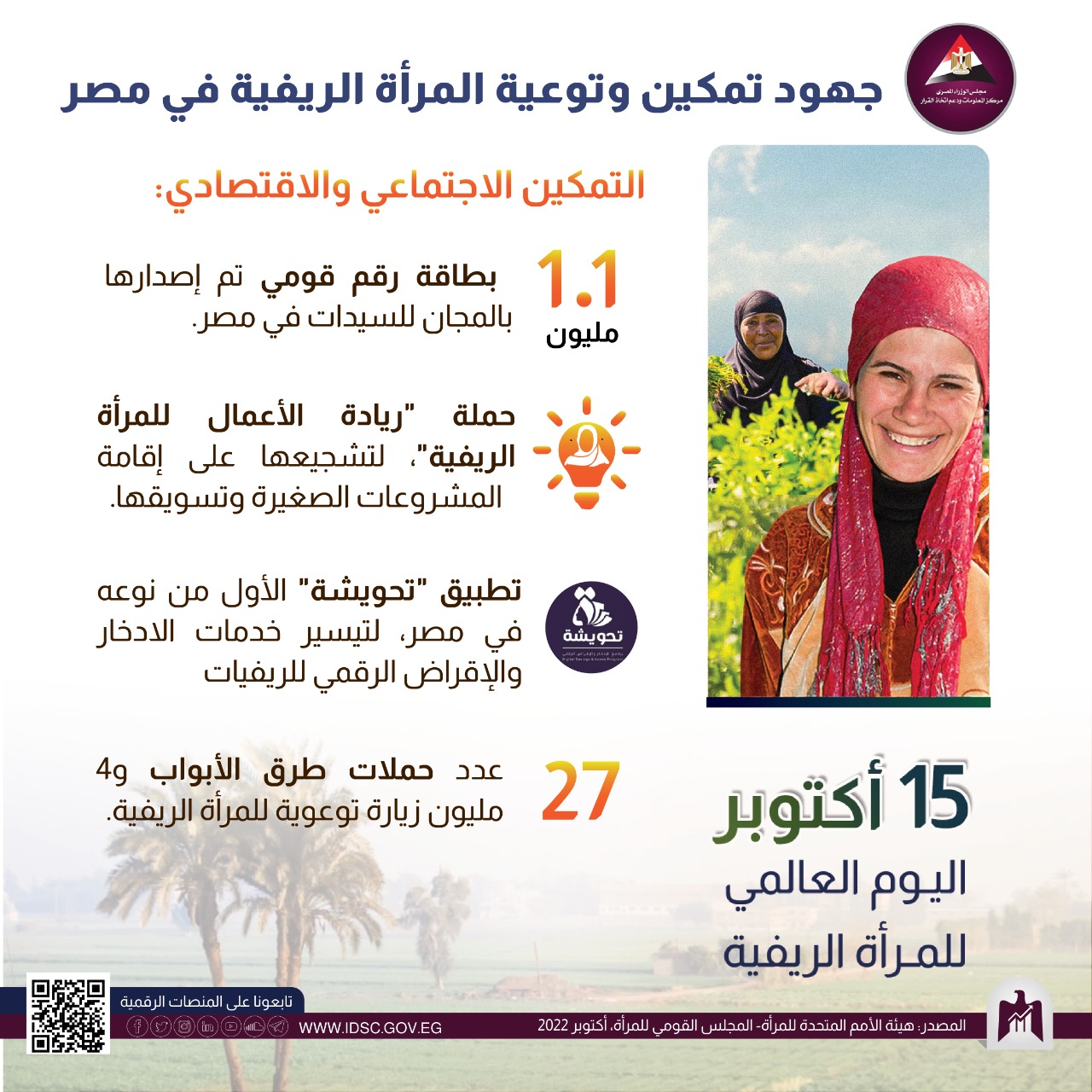 نشر مركز معلومات مجلس الوزراء، في إطار الاحتفال باليوم العالمي للمرأة الريفية والموافق الخامس عشر من أكتوبر انفوجرافيك حول تمكين وتوعية المرأة الريفية في مصر.