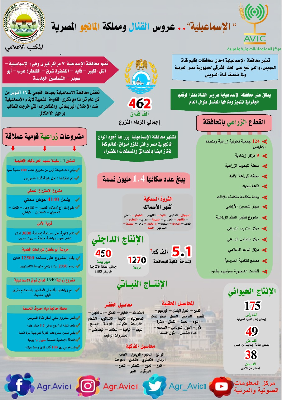 نشر مركز المعلومات الصوتية والمرئية بوزارة الزراعة واستصلاح الأراضي، انفوجراف بمناسبة العيد القومي لمحافظة الاسماعيلية، تحت عنوان: "الإسماعلية"..عروس القنال ومملكة المانجو المصرية، حيث تحتفل بعيدها القومي فى 16 أكتوبر من كل عام تزامناً مع ذكرى المقاومة الشعبية لأبناء الإسماعيلية ضد الإحتلال البريطاني والمظاهرات التي خرجت لتطالب برحيل الإحتلال.