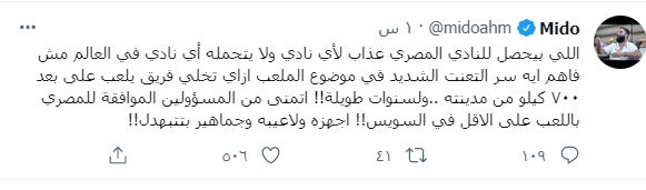 وقال أحمد حسام ميدو عبر صفحته الرسمية بموقع "تويتر"، اللي بيحصل للنادي المصري عذاب لأي نادي ولا يتحمله أي نادي في العالم مش فاهم ايه سر التعنت الشديد في موضوع الملعب ازاي تخلي فريق يلعب على بعد 700 كيلو من مدينته ..ولسنوات طويلة!! اتمنى من المسؤولين الموافقة للمصري باللعب على الاقل في السويس!! اجهزه ولاعيبه وجماهير بتتبهدل!!".