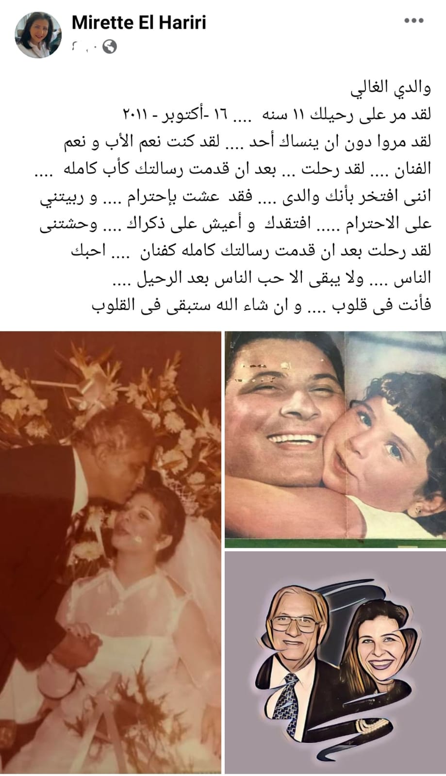 قائلة ميريت الحريري:"والدي الغالي لقد مر على رحيلك 11 سنة .. 16 أكتوبر 2011 لقد مروا دون ان ينساك أحد .. لقد كنت نعم الأب و نعم الفنان .. لقد رحلت .. بعد ان قدمت رسالتك كأب كامله".
