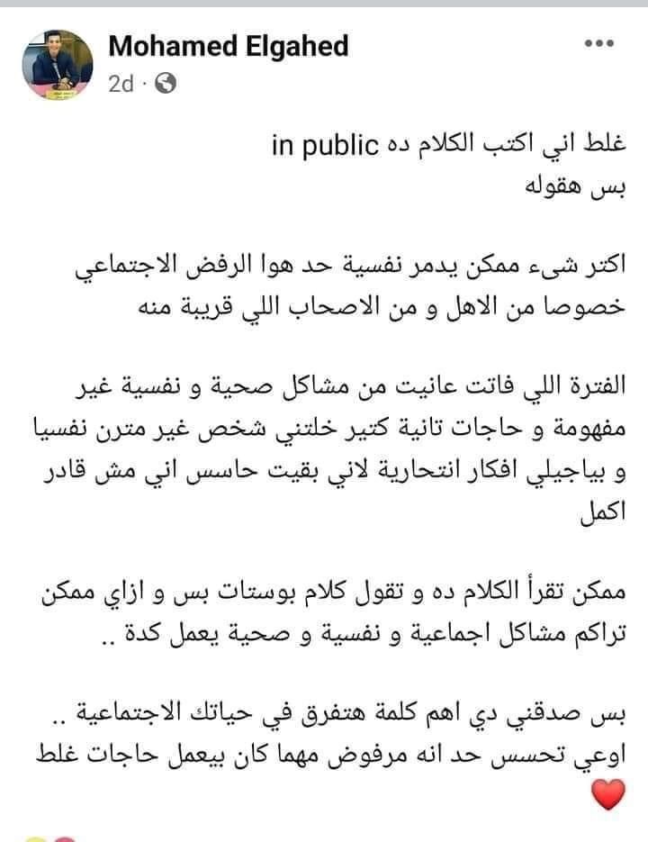 وتابع محمد الجاحد،" ممكن تقرأ الكلام ده و تقول كلام بوستات بس و ازاي ممكن تراكم مشاكل اجماعية و نفسية و صحية يعمل كدة .. بس صدقني دي اهم كلمة هتفرق في حياتك الاجتماعية .. اوعي تحسس حد انه مرفوض مهما كان بيعمل حاجات غلط".
