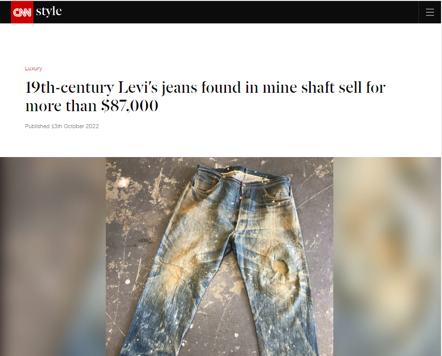 بيع بنطلون من جينز "ليفايز" يعود لثمانينيات القرن التاسع عشر فى مزاد ببلدة صغيرة فى نيو مكسيكو مقابل أكثر من 87000 دولار، حيث تم شراء الجينز - الذي عثر عليه عالم آثار في منجم مهجور - من قبل كايل هاوتنر، الذين يتمتع بخبرة بتاريخ الجينز، وفقا لموقع "cnn".