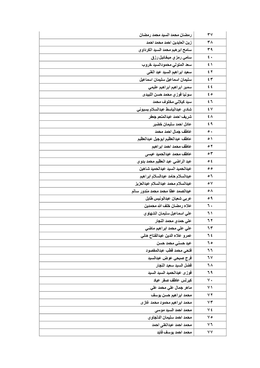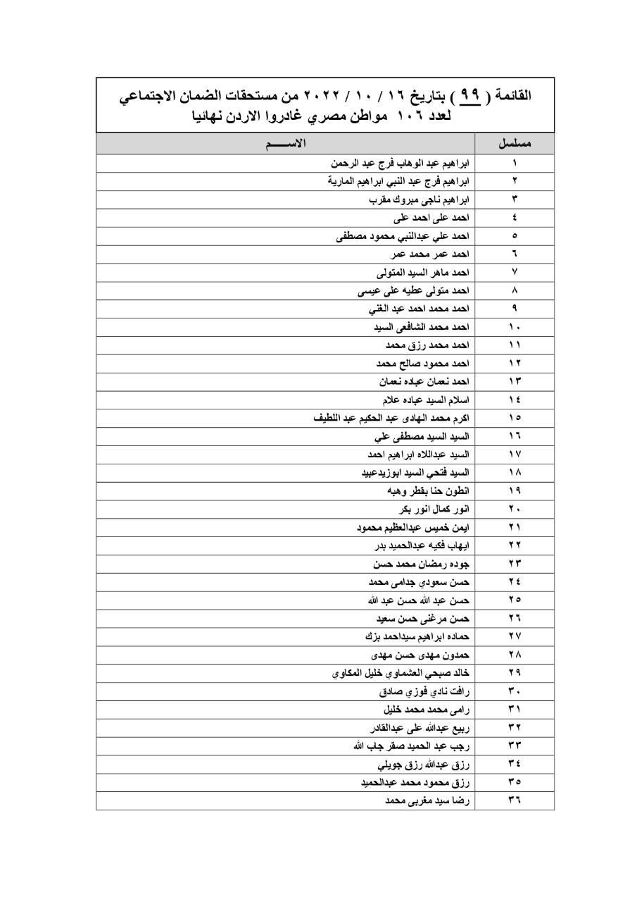 وأضاف الملحق العمالي، أنه طبقا لإجراءات المؤسسة العامة للضمان الاجتماعي بالأردن ، سيتم استرجاع المبالغ غير المصروفة بعد مرور 50 يوما من تاريخ الإعلان عن تحويل المستحقات، مشيرا إلى أنه يتم بشكل مستمر التنسيق والتجهيز لإرسال باقي الدفعات لمستحقيها تباعا ، فور تدقيقها من الجهات المعنية حفاظا على حقوق المواطنين المستحقين لهذه الدفعات ، وتضم القائمة الجديدة الاسماء المرفقة مع هذا البيان: