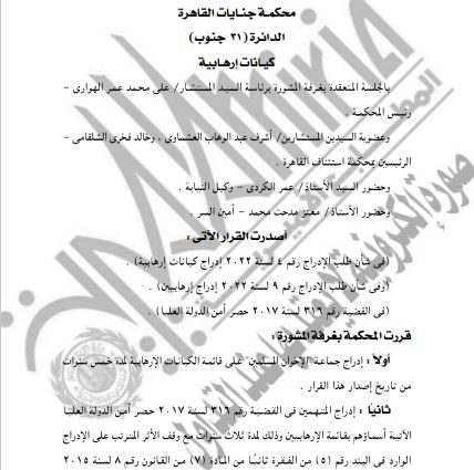 نشرت الجريدة الرسمية في عددها الصادر اليوم الثلاثاء، قرار محكمة جنايات القاهرة، بشأن إدارج جماعة الإخوان المسلمين على قوائم الكيانات الإخوانية لمدة 5 سنوات.