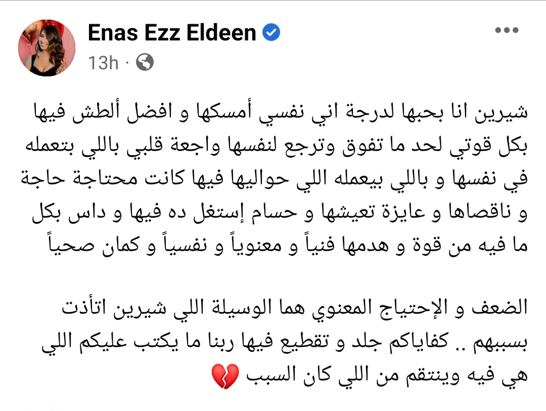 وتابعت:" حسام إستغل ده فيها و داس بكل ما فيه من قوة و هدمها فنياً و معنوياً و نفسياً و كمان صحياً الضعف و الإحتياج المعنوي هما الوسيلة اللي شيرين اتأذت بسببهم .. كفاياكم جلد و تقطيع فيها ربنا ما يكتب عليكم اللي هي فيه وينتقم من اللي كان السبب".